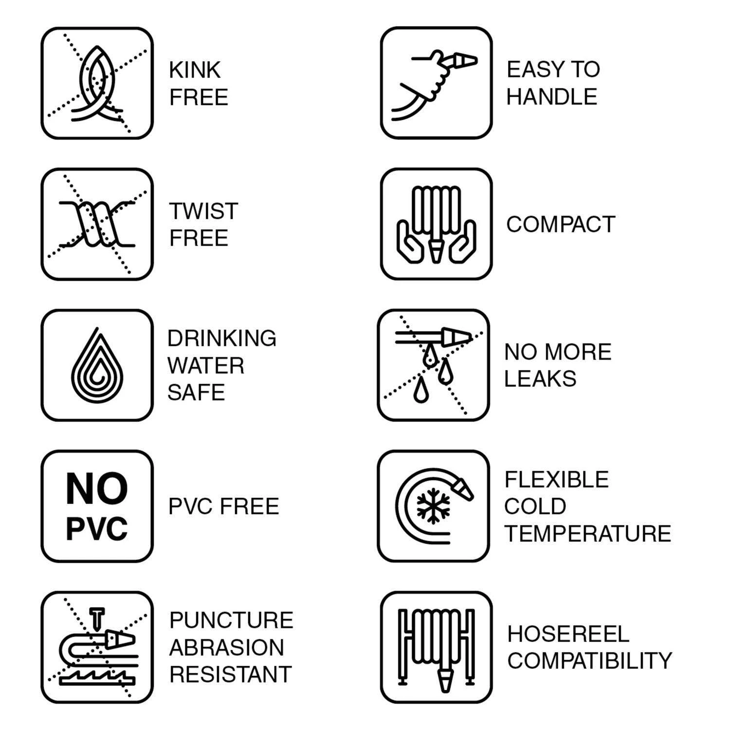 New technology allows higher flow in a smaller diameter than traditional hoses. Innovation in all aspects enhances ease of use in hose management, sustainability and improving the shopping experience. Due to its exceptional abrasion resistance the product is suitable for extensive use such as daily cleaning applications. The extra handling and its compactness make the product easy to use and to transport. Works with nozzles and sprinklers. FITT HiFlo technology allows extremely easy usage experience and it’s projected to save space (a third than a traditional hose). The compression fit couplings can be removed and replaced without damaging the hose or couplings. Insure easy connection and uninterrupted flow. 2X lighter and 3X more compact than a traditional PVC hose 10 to 15% higher water flow than the leading hose Ultra-soft inner core layer for superior manageability and high flexibility Construction forms a super strong, leak-proof connection High manageability and high flexibility in extremely cold temperatures (-4°F) No PVC, phthalates or lead drinking water safe High durable technology cover is abrasion resistant and puncture proof Double NTS chain mesh technology reinforcement eliminates flow restriction due to kinks and tangles Makes our couplings corrosion resistant and the strongest on the market