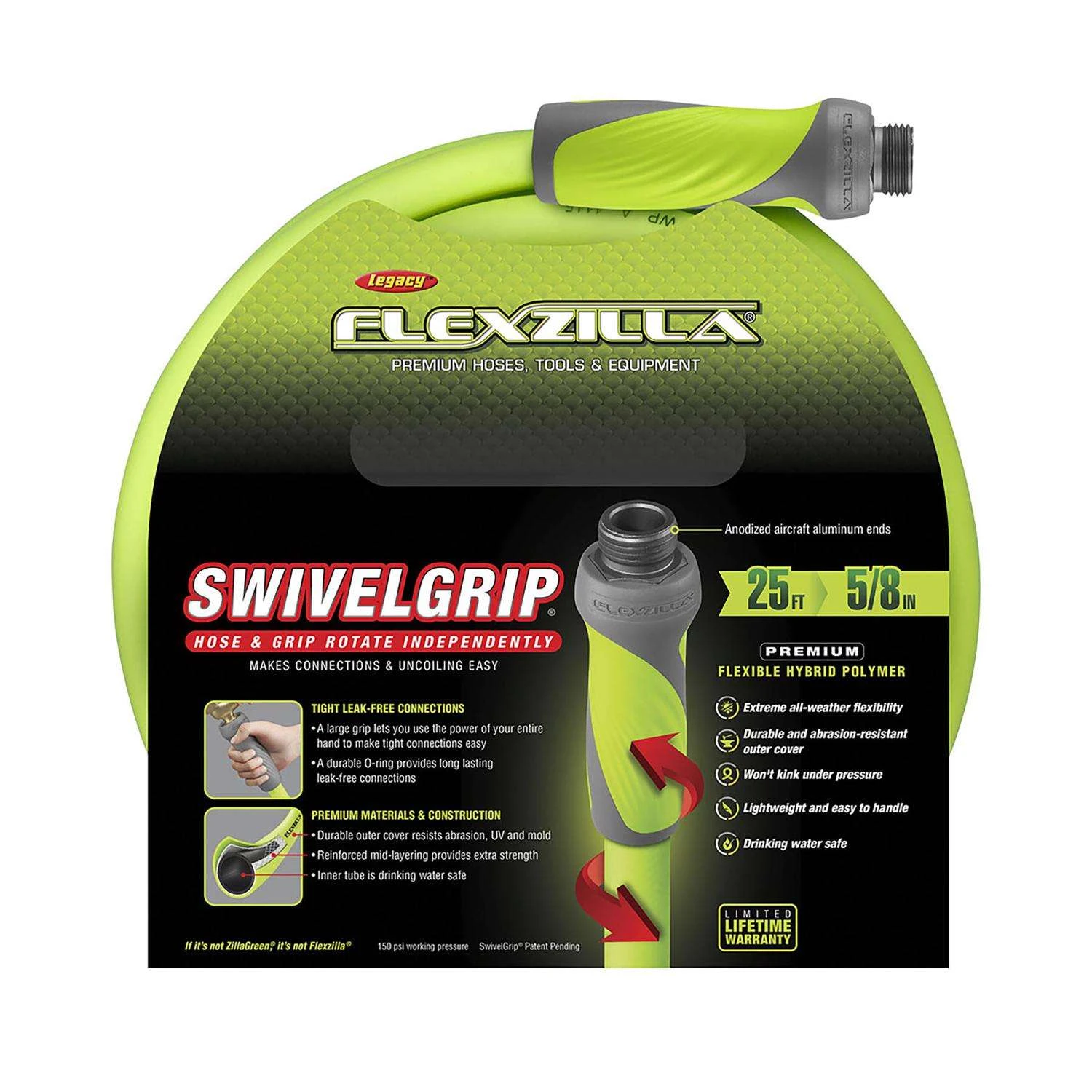 Premium Flexzilla® SwivelGrip® Garden Hose makes it easier to work around your home and lawn. SwivelGrip action eliminates twists that occur when uncoiling a hose. Conventional garden hose can trap coils that tighten into kinks as you move across the yard. SwivelGrip allows the hose and grip to rotate independently, releasing coils naturally, easily and effortlessly. The large, comfortable gripping surface on both ends of the hose lets you use the power of your entire hand to make tight connections easy. Flexzilla SwivelGrip Garden Hoses are engineered with a lightweight Flexible Hybrid Polymer which lays flat, eliminates kinking under pressure and is drinking water safe. Lays flat – no memory Male and female SwivelGrip® Connections Hose and grip rotate independently Makes connections and uncoiling easy Naturally releases coils SwivelGrip® Patent Pending Extreme all-weather flexibility Durable outer cover resists abrasion, UV and mold Won’t kink under pressure Lightweight and easy to handle